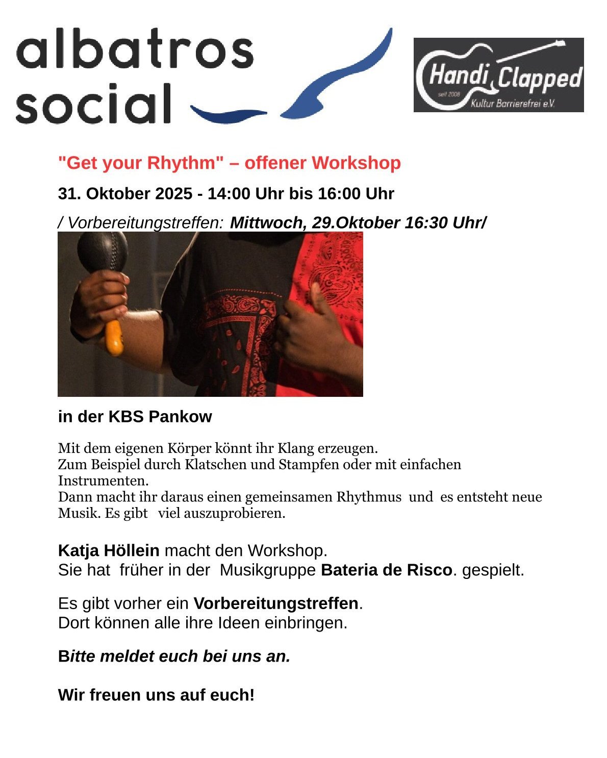 Fr. 31.10.2025 “Get Your Rythm” - offener inlusiver Musik-Workshop in Cooperation m. HandiClapped unter Anleitung von Katja Höllein (mit Anmeldung)